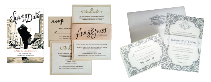 Wedding Invitation packages can include save the dates, invitation and envelope design, response cards and information cards.